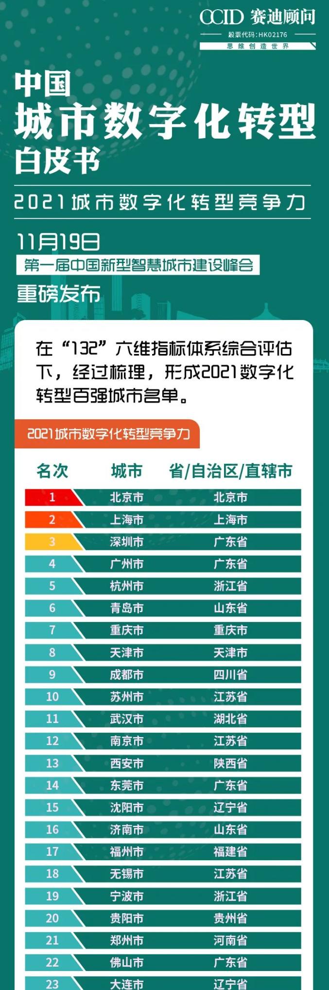 11月19日,第一屆中國(guó)新型智慧城市建設(shè)峰會(huì)在青島國(guó)際會(huì)議中心開幕,峰會(huì)上發(fā)布了《2021年中國(guó)城市數(shù)字化轉(zhuǎn)型競(jìng)爭(zhēng)力》評(píng)估結(jié)果,公布了“2021數(shù)字化轉(zhuǎn)型百?gòu)?qiáng)城市名單”。權(quán)威機(jī)構(gòu)賽迪顧問通過調(diào)取數(shù)據(jù)、
